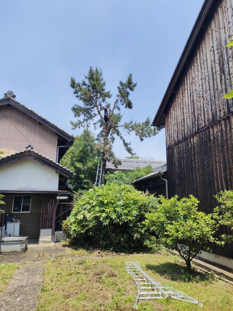 高木 特殊伐採 伐採・抜根 2025.06.202025.10.31 大きな松でした。 周囲は瓦屋根だらけで、真下に落とすしかない状況でした。 幹はかなり重いので小切りにして落としていきます 無事に根元まで伐採完了しました。 ご依頼ありがとうございました!