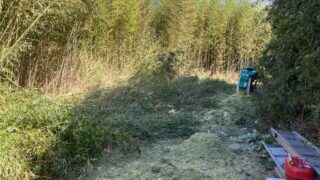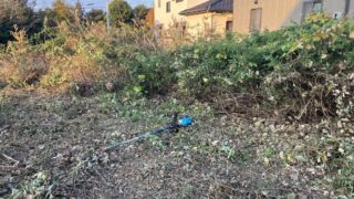 イバラが生い茂るジャングルでした。幹が太く、普通の刈り払い機じゃ前にも進めない状態です。30ccの高馬力の刈り払い機にシュレッダーブレードの一択です。この組み合わせでしか処理できない現場です。生きたスズメバチの巣がありました。夏だったら刺さ...