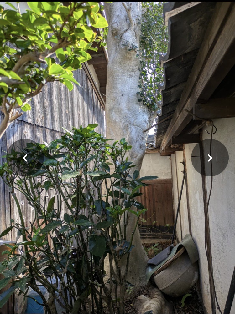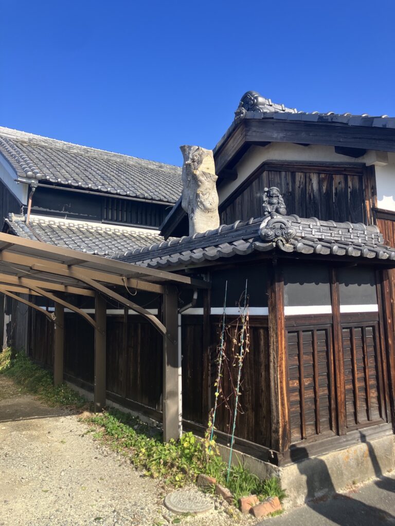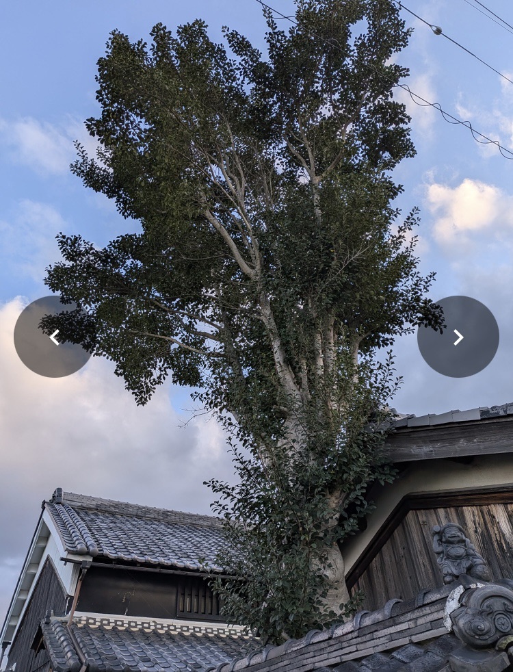 瓦屋根の建物、2つの合間から生えたモチの木でした。